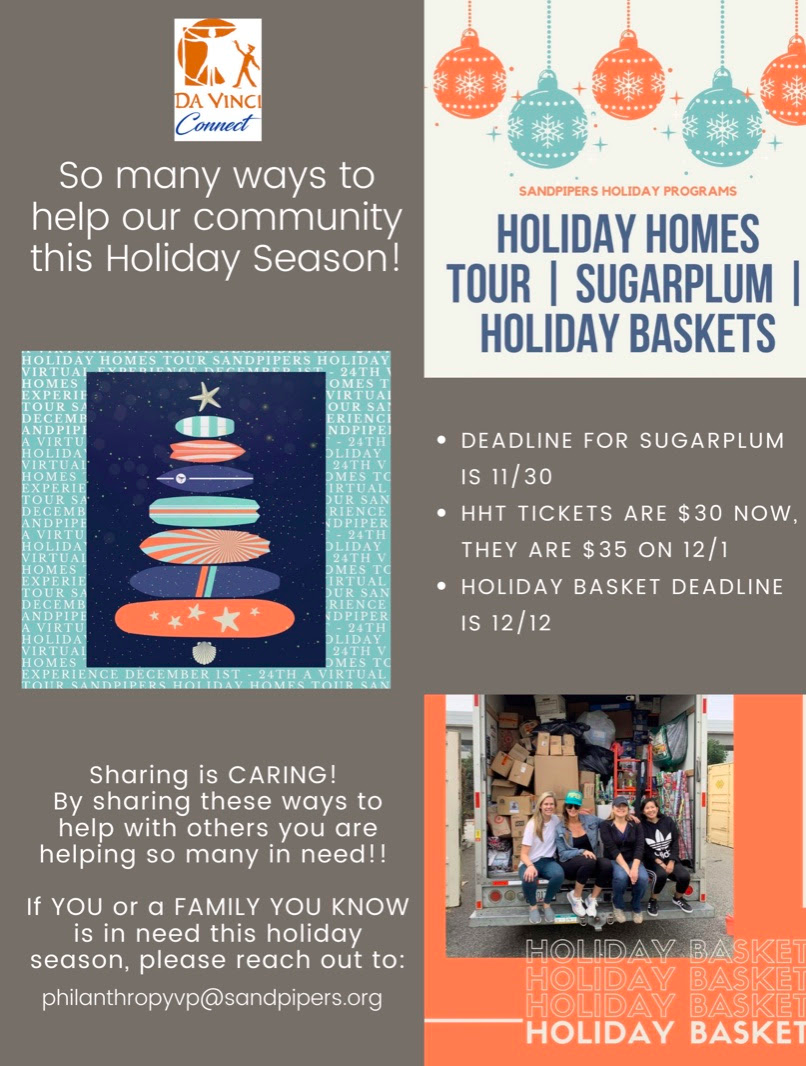 The FAN Kindness Movement at Da Vinci Connect is partnering with Sandpipers, an organization dedicated to serving the needs of the South Bay community through charitable and philanthropic programs for 88 years. This holiday season, there are three exciting ways (and two rounds of giving opportunities) for you and your family to help others in our community, and to also help various agencies such as Trinity Healthcare, Harbor Interfaith, Meals-on-Wheels, Project New Hope, Project Needs, Mychal’s Learning Place, and many more!